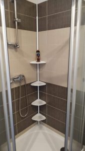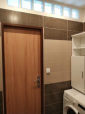 Sociální zařízení: Byt má vyzděné jádro s novou koupelnou a toaletou. Zvětšená koupelna je prosvětlená skleněnými dlaždicemi a nachází se v ní prostorný sprchový kout, umyvadlo se skřínkou, topný žebřík a pračka s připojeným odpadem. Toaleta je v samostatné místnosti s malým praktickým umyvadlem.